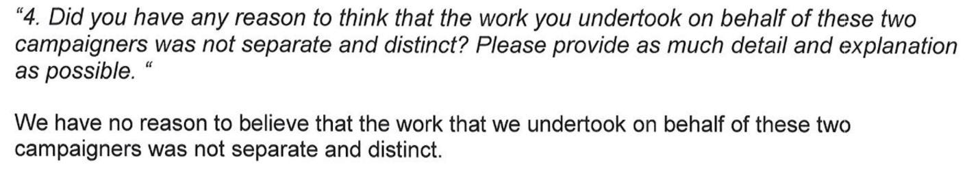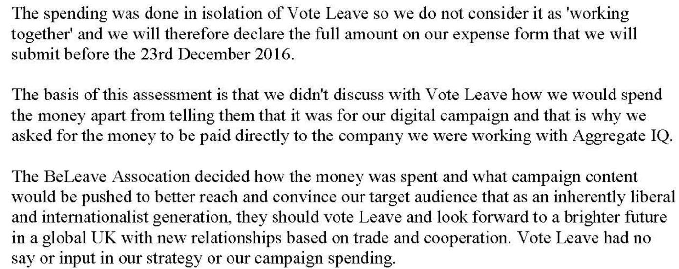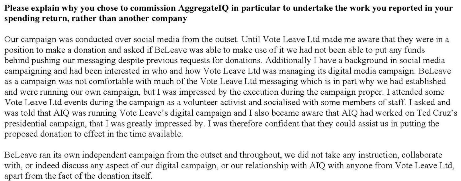There is one further piece of evidence in the cache: an extract from a letter sent to the Electoral Commission by Aggregate IQ recording the question and giving the answer.