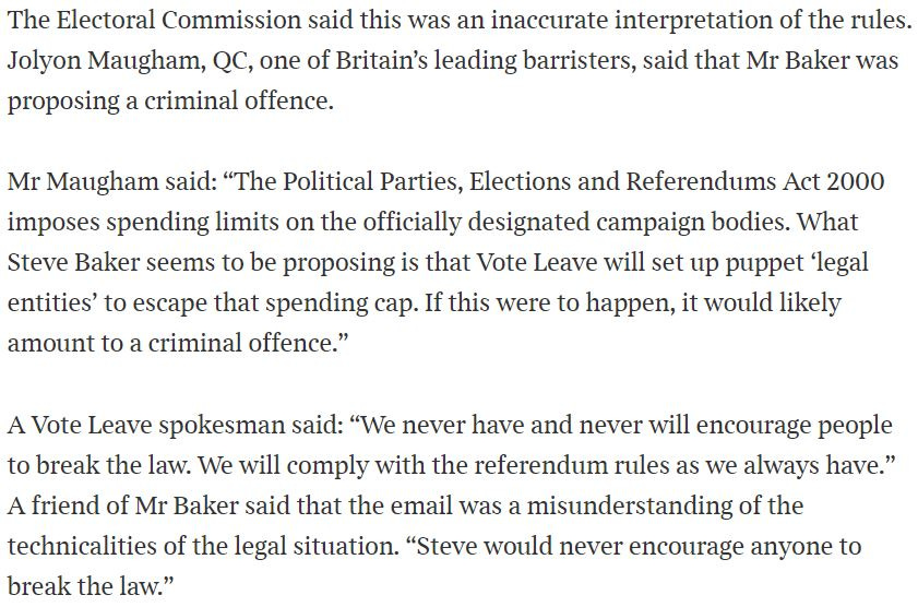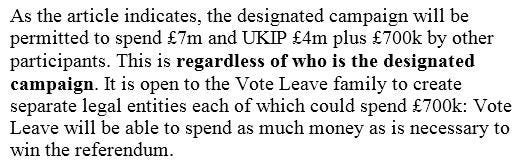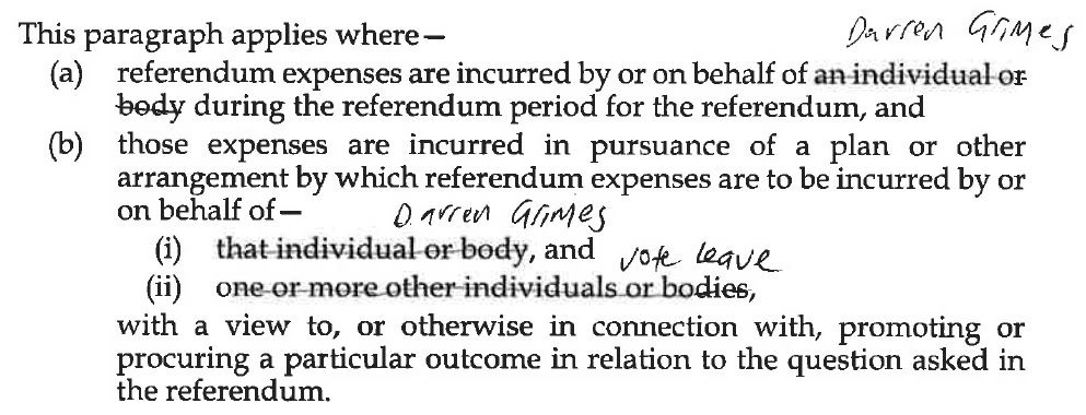 And Vote Leave was duly given the designation, the Referendum was held, and the rest was history. Or may be. In early August, shortly following the Referendum, the inestimable Marie Le Conte broke a story about a Mr Darren Grimes: Mr Grimes was a fashion design student with a modest presence on social media: around 6,000 Facebook fans and 4,000 Twitter followers. In the weeks leading up to the Referendum campaign Vote Leave had, or so we were told, given Mr Grimes £625,000 and he had received a further £50,000 from an unidentified individual. The total was just under the £700,000 Steve Baker's email foretold. Let me break off at this point to try and describe the law. The law imposes spending limits to seek to protect our democracy from capture by those with endless money to spend. And, to protect those spending limits, it stops organisations from establishing puppet entities, each with their own spending limit. The relevant definition for whether an organisation is working as a puppet is this (and I've annotated it to make the legislation easier to read):