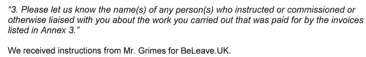 Mr Grimes independently decided to spend £625,000 with the same obscure foreign organisation as was delivering Vote Leave's messaging.