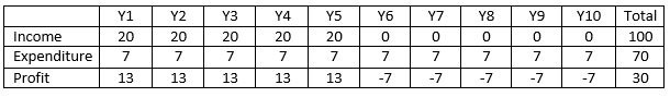 Over ten years, XCo will have 100 of income, 70 of expenditure and 30 of profits. Did I say everyone else? I meant everyone else except the Government. What Government does is look at a fixed term, typically five years, and any cash it can shovel into that five year term it treats as income. So if Government devises a legislative measure which enables it to move income in Years 6-10 to Years 1-5 it will treat that income as income of Years 1 to 5. Let's assume the Government does this with those tens in Years 6-10 in Table One. You then have a table which looks like this