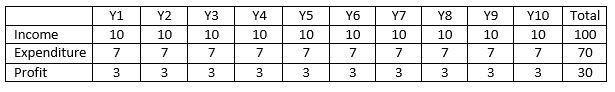 In the normal world, the world that you and I occupy, you and I and everyone else, income is income and expenditure is expenditure. So if you're XCo and you project your profits for the next ten years they'll look, let's say, like this
