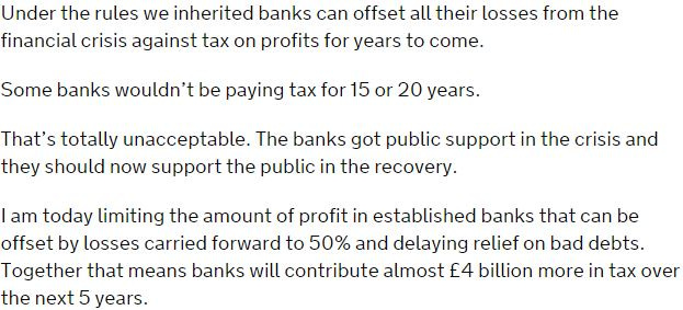 Take a step back. If you're making a profit today, it's rather nice to have made losses yesterday. You can set them against today's profits and use them to reduce today's tax liability. What George Osborne did was to say that instead of using all those losses today, banks would have to share them between today and tomorrow. This means banks pay more tax today - so the Government gets more income today (my Table Two). But over today and tomorrow, the banks pay the same amount of tax and the Government gets the same amount of income (compare with my Table One). Why does all this matter? Go back to my Table Two. Over Years 1-5 the Government appears to have 50 more of 'profits'. It uses these 'profits' to tell the public it has reduced the deficit. And it ignores the fact that in Years 6-10 it will be 50 worse off. And it has. And it does. But let's call this what it is. It's a lie. In no meaningful sense has the Government brought down the deficit by those five 10s. Or, putting the matter another way, it has brought down the deficit by 50 in Years 1-5 only by increasing the deficit by 50 in Years 6-10. You should be mightily cross about this. Of all the measures in the Autumn Statement, bank losses restrictions were said to have the biggest yield by far. But the actual yield from the measures is the time value of getting the money early. Which in a low interest rate environment is zero. And it gets worse. This isn't the first time the Coalition has pulled this trick. The biggest 'yielding' measure in the 2014 Budget involved an identical sleight of hand. As did the second biggest. Add those three measures together and you have a £10bn sized lie. Told in a single tax year. [twitter-follow screen_name='jolyonmaugham']