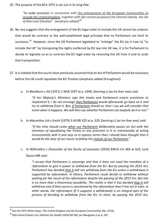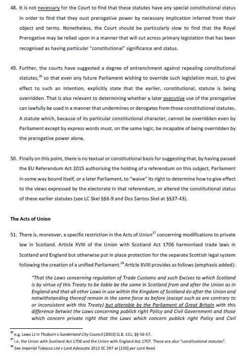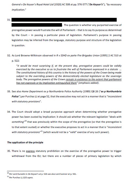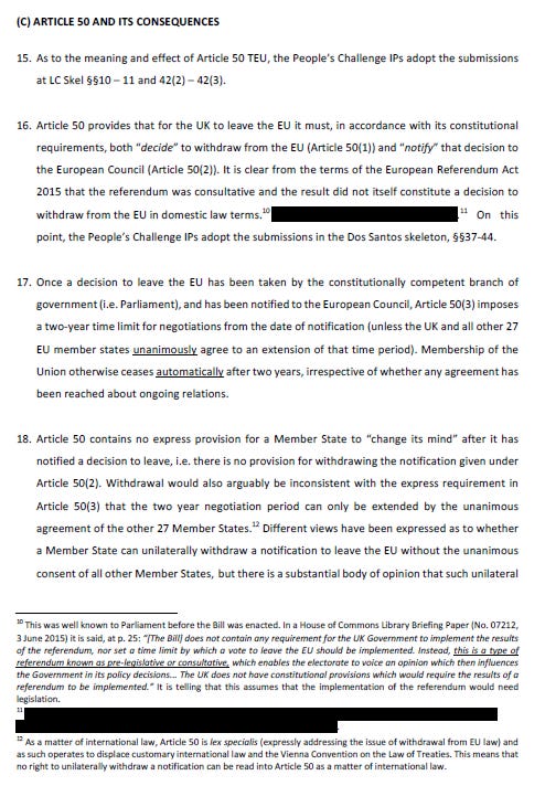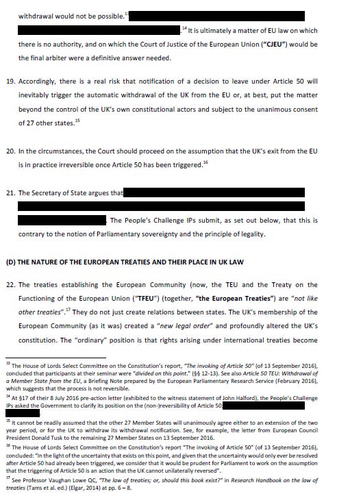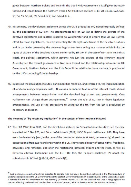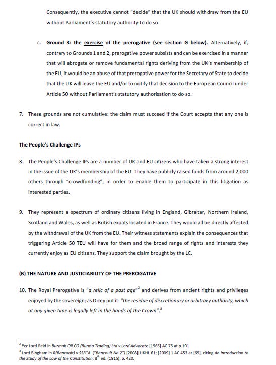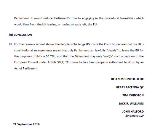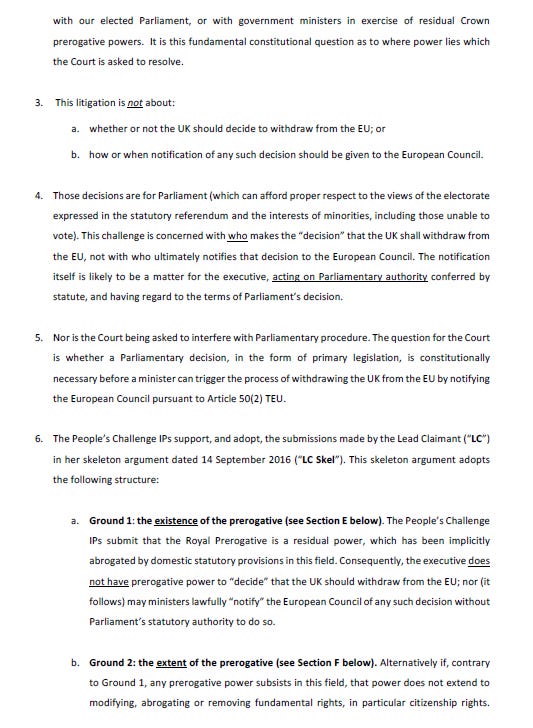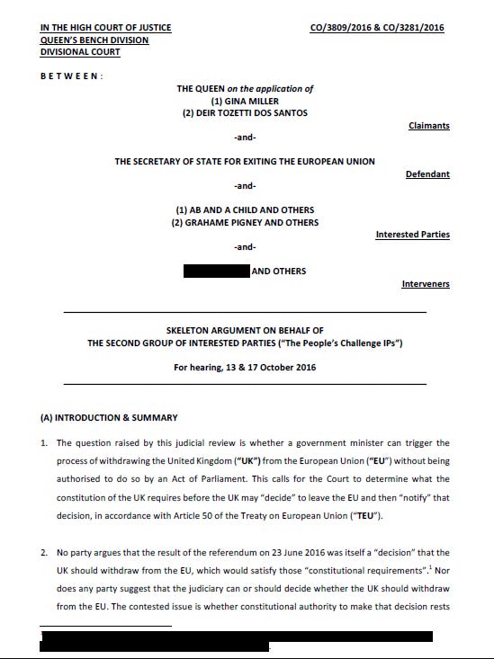 What follows is a copy of the Skeleton served by the 'Interested Parties' in the action before the High Court to establish whether an Act of Parliament is needed to trigger Article 50.