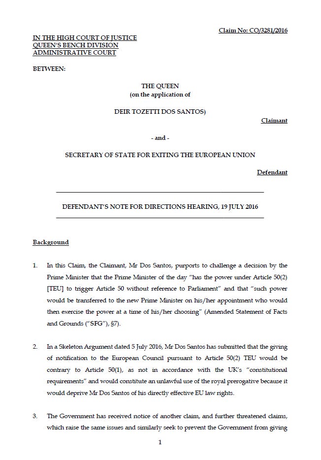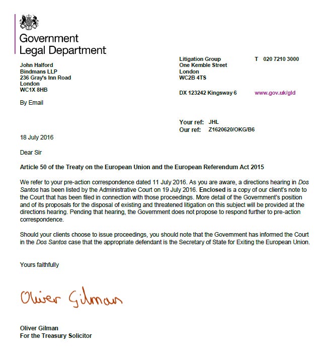 Consistently with my promise that this Crowd Justice funded litigation on Article 50 should be conducted transparently, I post here the (rather disappointing) response received today from the Government.