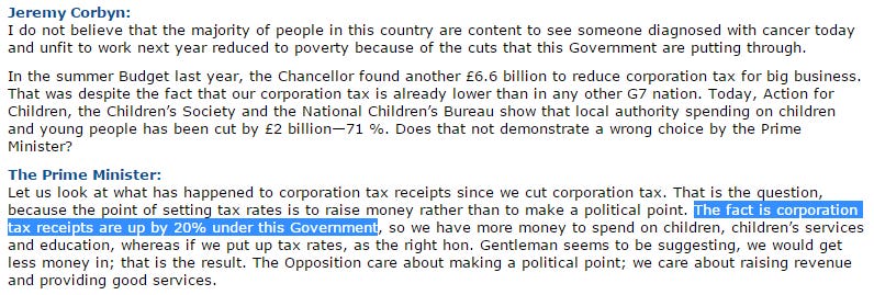 Postscript: Iain Campbell points out that in 2009/10 receipts were (at £36.628bn) a sum a 20% increase to which gives you that recorded in 2014/15. If that is the 'explanation', Cameron is taking 'credit' for policies that Labour introduced: the first cut to Corporation Tax under the Coalition took place with effect from the 2011/12 tax year. It also invites the observation that in 2008/09 corporation tax receipts were £43.927bn: materially higher than now they are even in cash terms.