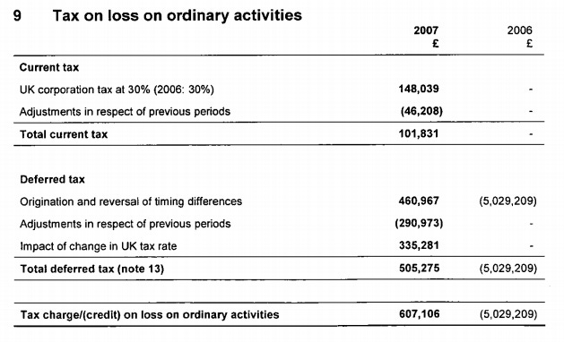 You will see that, for the year ending 31 December 2007 there was a total current tax charge of £101,831. Google UK Limited's deferred tax asset (basically a limited right to reduce your tax bill acquired in past years) does not seem to have absorbed that charge.