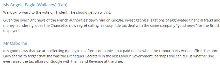 Note, in particular, that George Osborne said of Google that it "paid no tax when the Labour party was in office."