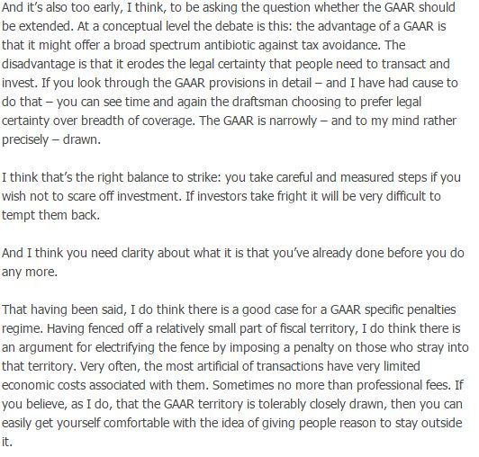 We have supported the introduction of a General Anti-Abuse Rule (GAAR). Those who set up abusive schemes should run the risk of being caught by such a rule. But it is currently a GAAR without teeth. Those who are caught have to repay the tax they tried to avoid, but they do not face a penalty. There is still no disincentive to try and game the system. That is why Labour will bring in a tough penalty regime for the GAAR, with fines of up to 100 per cent of the value of the tax which was avoided. For the first time this will provide a tough and genuine deterrent to those who try to abuse the system and avoid paying their fair share of tax.