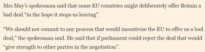 What 'having a meaningful vote' then means (in effect) is Parliament having the ability to reject whatever deal Number 10 strikes with Brussels without us having to leave without a deal. It has that ability if it can revoke - or ask the electorate whether it wants to revoke - the Article 50 notification so that we remain in the EU.