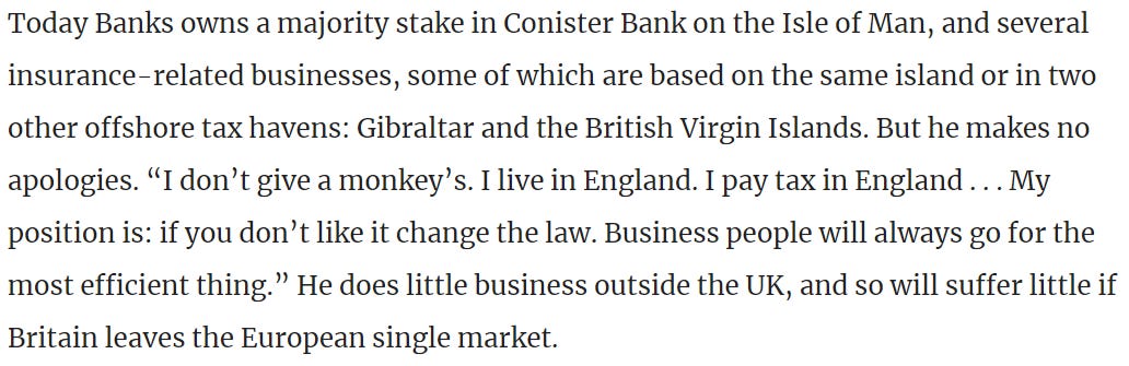 Arron Banks has a network of companies set up in tax havens according to this Guardian report. Concerns about his tax affairs have been raised by Charlie Elphicke MP. And his name appeared in the Panama Papers.