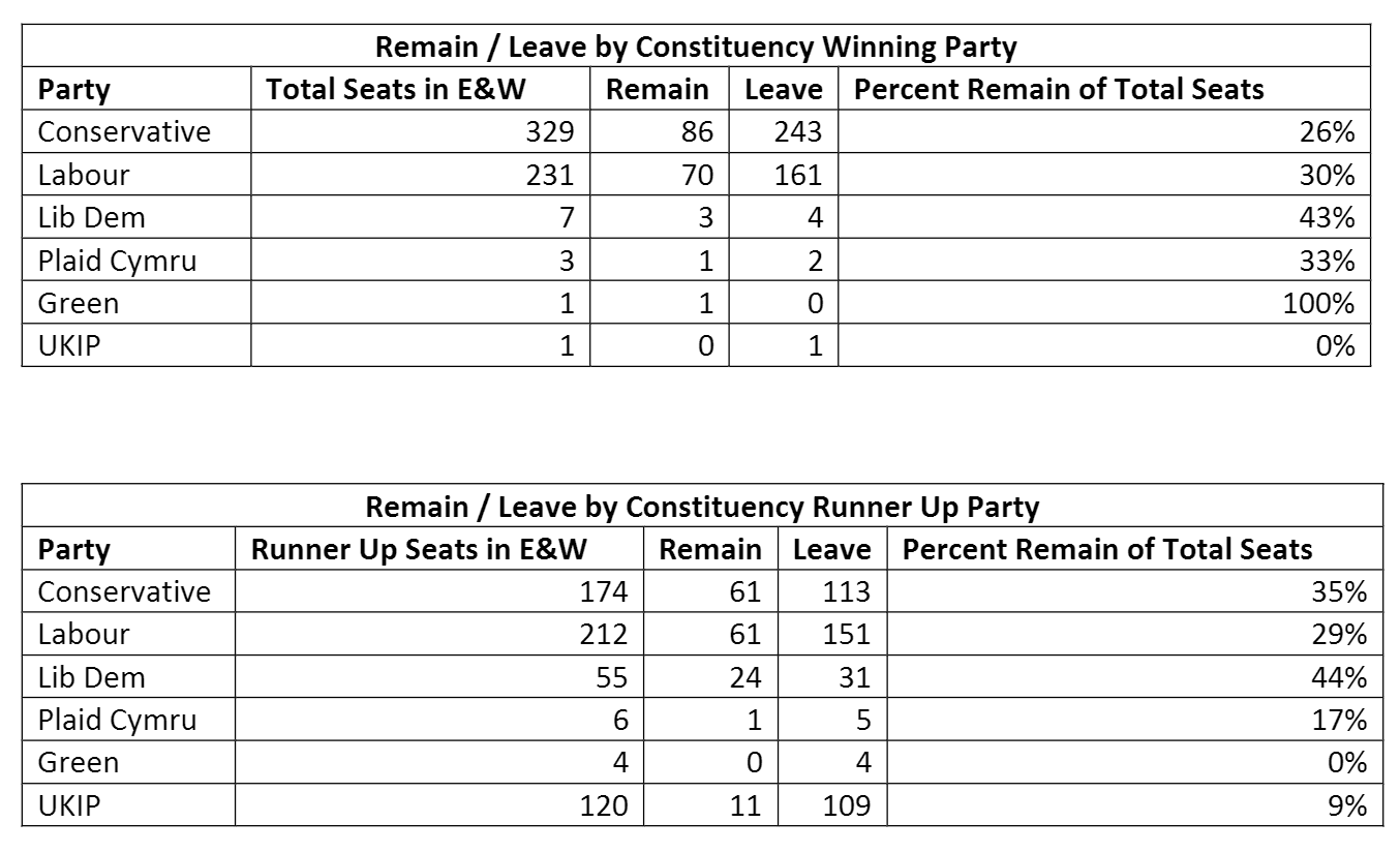 Especially interesting are these tables which show, for England and Wales, how many constituencies of each political party voted Remain and Leave and how many constituencies of each runner up political party voted remain and leave.