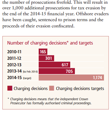 revealing 2,962 actual and prospective charging decisions. Did only 11 of those lead to convictions? No. We can now conclude that by including that table - which includes charging decisions for such matters as wrongfully claiming tax credits - HMRC set out to mislead you as to its success in tackling offshore tax evasion. Not lying - because the document does not explicitly state that those are charging decisions in relation to offshore evasion - but an attempt to mislead. That's a serious charge - so don't take my word for it. Have a look at that table and the context in which it appears. Look at the document and at the page. It appears in a document about offshore tax evasion. As the screen-grab above shows, it appears at the end of a paragraph talking about offshore tax evasion. Nowhere I can see in that document is it made clear that that table has nothing to do with offshore evasion.
