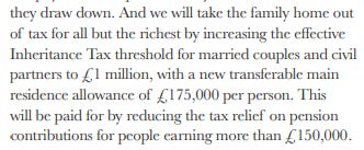 But another, on which the Manifesto is silent, is that the rewards from working are diminished to increase the rewards from not working. Leave aside the numbers: 332,000 people are expected to earn over £150,000 this tax year (Table 2.1). And they will pay more tax to enlarge the after tax pot available to be shared between the beneficiaries of (fewer than) 43,800 estates. So the rewards from the many will accrue to the few. But what is the story you tell the electorate when you diminish the rewards from work in order to enhance those available to be shared between people whose sole claim to them lies in an accident of birth?