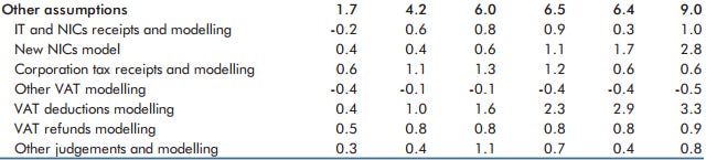 These modelling changes projected substantial increases in in-year and future year tax revenues. As you can see from the chart above, these projected increases in future revenues were substantially attributable to "modelling" changes to NICs and VAT (explained at, in particular, Box 4.2).