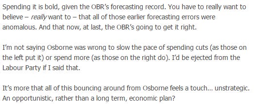 As I pointed out here (but others have shown far more elegantly) the OBR's forecasting record is consistent only in its tendency to optimism.
