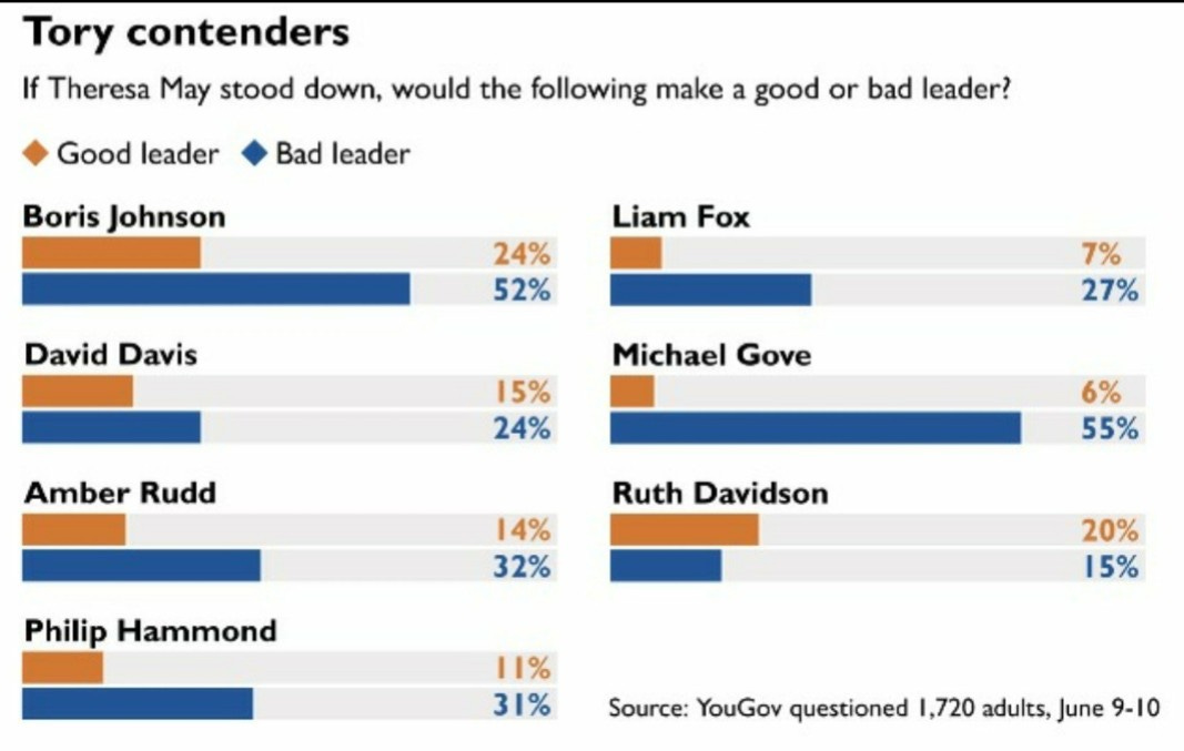 They range, as can be seen, from the fantastically toxic Michael Gove to the public's choice, Ruth Davidson. The race looks certain de facto to be a third - in the space of little over a year - referendum on the nature of our future relationship with the EU.