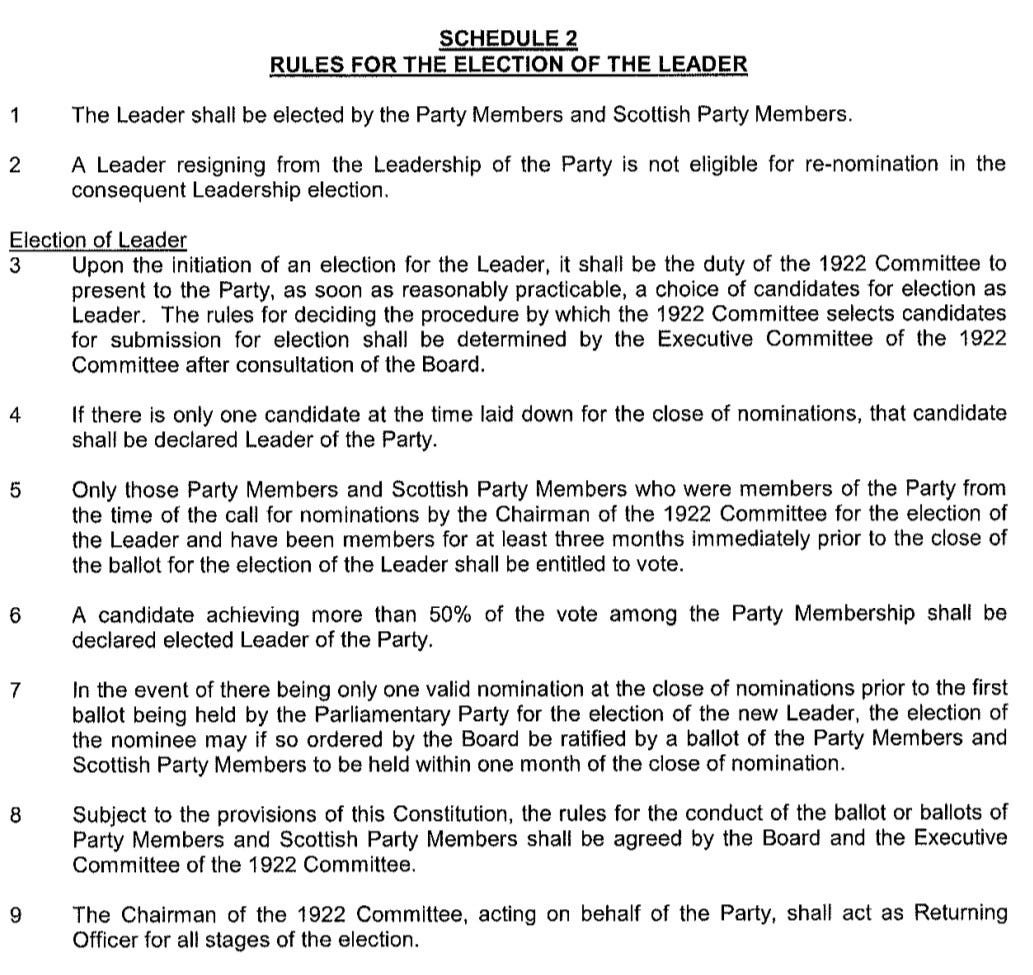 The procedure whereby the leader is chosen is set out in Schedule 2 of the Conservative Party Rulebook.