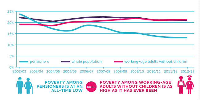 Pensioner poverty is now at a record low level; from having a greater risk of poverty than the rest of the population in the 1980s, pensioners now have the lowest poverty of any age group. But as that has happened, poverty among working-age adults has risen, and has never been higher than it is now.