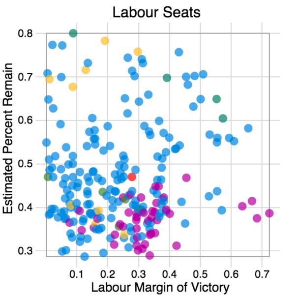 The following two charts show seats in England and Wales where Labour was Runner Up by margin of victory, support for Brexit and (by colour, Winner). The first shows all seats where Labour was Runner Up. The second highlights those Remain supporting seats where the winner's margin over Labour was less than 15% (they total 18: 14 Conservative, 2 Lib Dem, 1 Plaid Cymru and 1 Green).