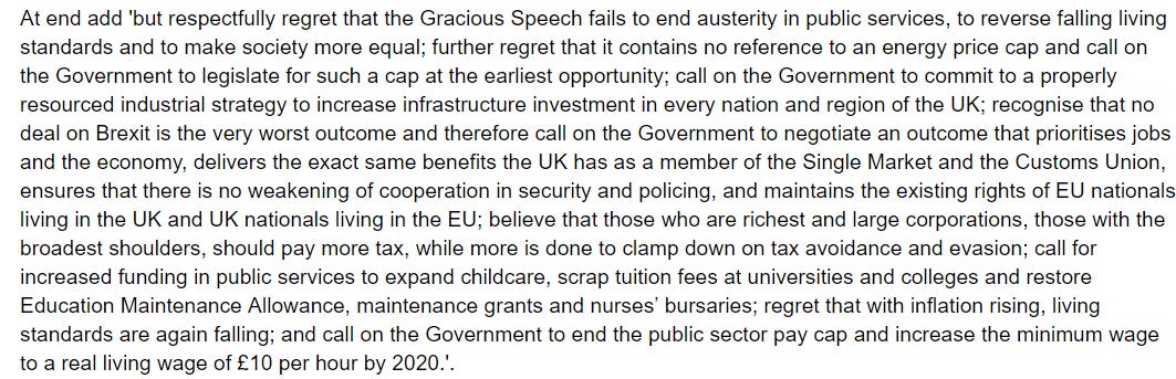 And we know that 87% of Labour's membership wants the UK to remain in the single market and over 78% want a vote on the final deal (link). But Jeremy Corbyn's voting record on the EU before he became leader and his actions since becoming leader have led to a sense amongst many that Brexit will be an exception to his vision of direct democracy. And this poses a major political headache for Labour. Labour outperformed expectations in the 2017 General Election. But data from the British Election Study shows that Brexit was the defining issue of the General Election and that Labour's relative - after all, it received 55 seats fewer than the Conservatives - success was attributable to it gathering votes from those who perceived it as the party of Soft, or No, Brexit. If that perception is disappointed then, all other things being equal, Labour will suffer badly at the next general election: those voters will have no or a diminished reason to vote Labour. It may be worse: some or many may feel a vigorous antipathy towards a Party that betrayed what they believed they were promised. How, then, should the leadership reconcile its pro-Brexit leanings with its desire to retain those votes? The obvious candidate strategy is to signal soft Brexit positions but fail to take Parliamentary action to deliver them - and then seek to blame the Government. And this has been the Party's strategy to date. The best evidence of this can be seen from the events of the Queen's Speech. Labour's Manifesto promised: