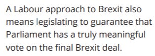 But the “exit day" is defined as "such day as a Minister of the Crown may by regulations appoint.” Now. When important stuff gets done by regulations the government usually recognises that parliament should have control over those regulations. And, sometimes, the European Union (Withdrawal) Bill does. For example, if, in planning our departure from the EU we forget about some dusty bit of legislation that once made reference to an EU institution, and a Minister of the Crown wanted to put that right with a regulation, she would have to put a copy of her regulation before both Houses of Parliament and both Houses would have to approve it. But not all the time. Because, when it comes to determining the date of our departure from the EU, the government proposes that there be no parliamentary control at all. And if Labour agrees to this clause it will be handing over to a Minister control over the date and form of our departure from the EU. Sir Keir's promise will be revealed to be no more than empty virtue signalling to its Remain support. Moreover, if that wasn't clear enough, Labour will also, by agreeing to that clause, be ignoring that same Manifesto pledge: