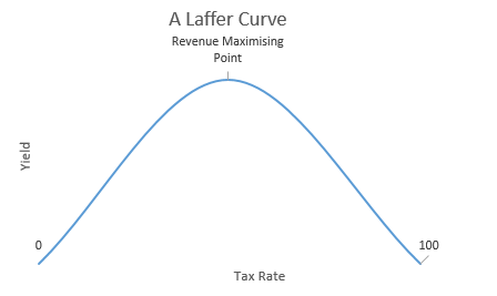 The logical consequence of these two propositions is that there is a rate more than 0% and less than 100% at which the tax yield is the highest - what we call the 'revenue maximising' point. Set tax rates too low and Government relinquishes more plums than it must. Set it too high and your taxpayers may defect to your neighbour, not bother at all, or be heavily incentivised to find ways to dodge your plum tax.