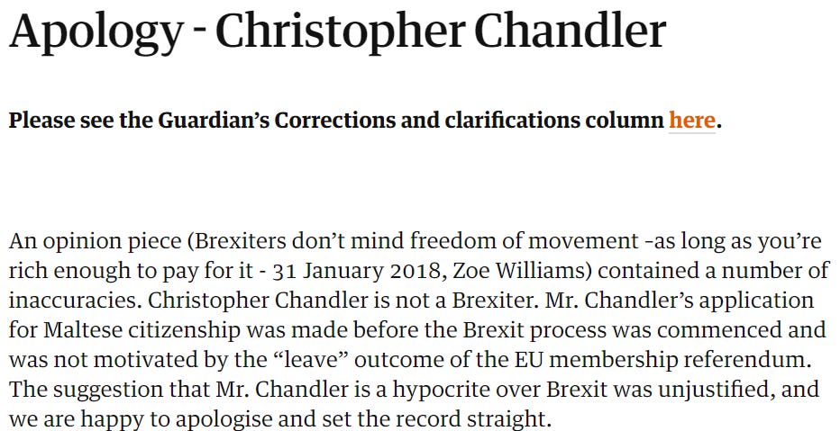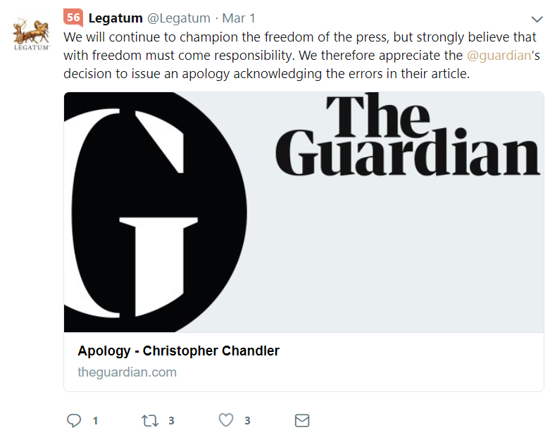 Legatum, on the other hand, has used its money and the power that comes with it to stifle criticism of Christopher Chandler advanced by media with even modest reach whilst claiming to "champion the freedom of the press". Christopher Chandler has failed to apologise or acknowledge I am entitled to an apology for a false and ugly smear whilst Legatum trumpets the claim that "with freedom must come responsibility". Christopher Chandler has objected to suggestions of "hypocrisy over Brexit" but Legatum behaves hypocritically when it comes to press freedom.