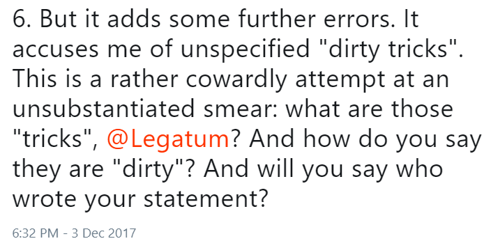 At the time, I stated that that allegation was in error. And I asked Legatum to specify what "dirty tricks" I was guilty of.