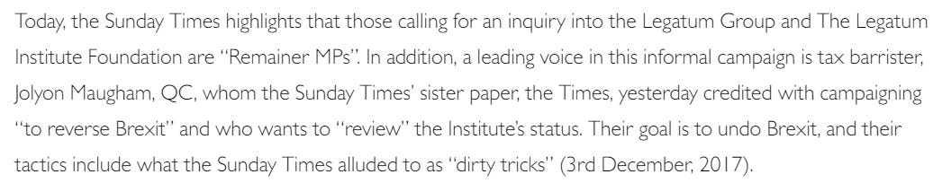 Let me say that I am happy to defend my conduct and I accept it is a legitimate matter for reasonable open public debate. I have addressed my position on tax avoidance here. And I am happy to confirm I took advice from a QC specialising in charity law before expressing the view I did that the Legatum Institute's conduct was likely on the wrong side of the law.