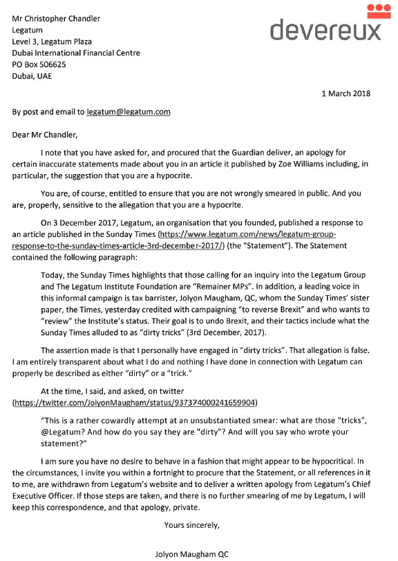 I referred to Christopher Chandler's objection, as revealed by the Guardian's apology, to the accusation of hypocrisy. I referred to Legatum's false and ugly smear of me. I assumed Mr Chandler would want that smear to be withdrawn. And for an appropriate person at Legatum to apologise for it. And I undertook to keep the apology private. I did not seek damages. I did not seek his or Legatum's embarrassment. I asked him to behave honourably and decently.