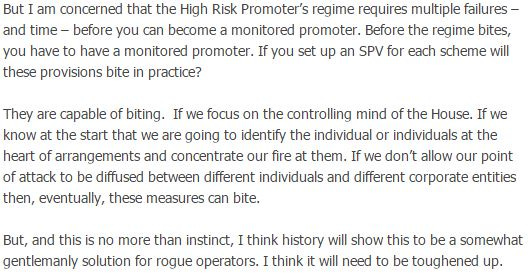 A further concern I expressed in the Hardman Lecture was that the High Risk Promoters Regime introduced several months earlier in the Finance Act 2014 might not be fit for purpose: