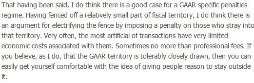 Several days later, Ed Balls announced that the Labour Party would, on taking Government, introduce such a regime. And in the Autumn Statement, the present Government, too, announced that it intended to follow suit and would consult on whether and how to introduce a GAAR specific penalties regime.