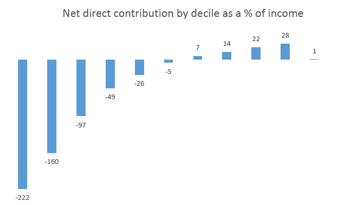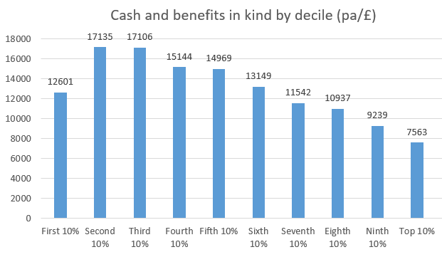 Of course, looked at as a percentage of income rather than in absolute terms, the poorer deciles benefit more than this chart reveals. But in absolute terms the differences in the extent to which the deciles benefit directly from Government are far less profound than you may expect.