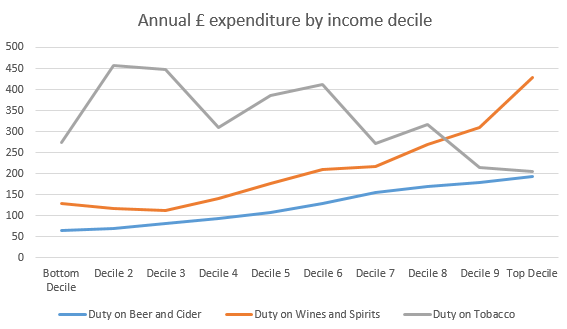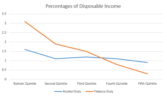 The proportion of your disposable income consumed by tobacco duty, for example, falls sharply as your income rises. But with alcohol, not so much (source: ONS).