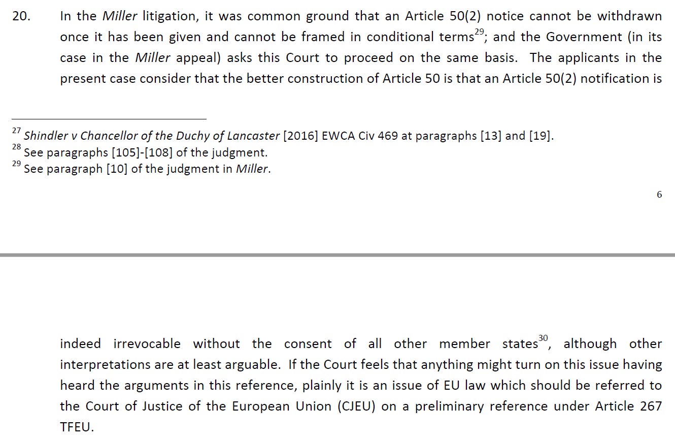 First, the Applicants are (to the best of my knowledge) the only parties gently to moot the possibility of a reference to the Court of Justice of the European Union on the question of the revocability of a notification under Article 50. Even occasional readers of mine will know that I believe that establishing the revocability of a notification to be the key to changing the political dynamics of the Brexit debate. So I regard this as a significant development.