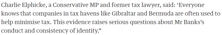 10.= John Stuart Wheeler gave £250,000 to Vote Leave Limited. The Guardian has written of his £5m donation to the Conservative Party in 2000 which was followed shortly thereafter by Conservative MPs seeking to change the Finance Bill in a manner which would benefit the tax treatment of financial spread-betting, the industry in which Mr Wheeler then operated. Jonathan Wood also gave £250,000 to Vote Leave Limited. There is a Jonathan Wood, hedge fund manager, who has made substantial donations to the Conservative Party. The Evening Standard reports he has lived in Switzerland and Monaco - both might reasonably be described as tax havens.