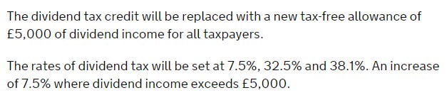 You'll remember the Budget Red Book published last week which recorded an increase of 7.5% in the rate of tax paid on dividend income above £5,000: