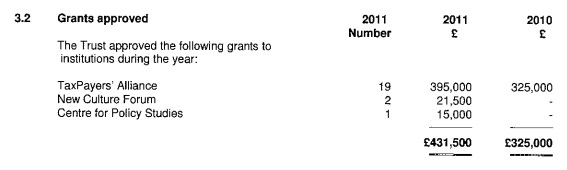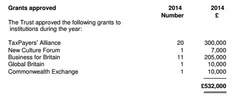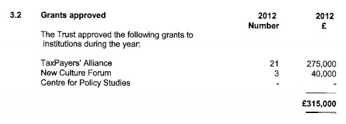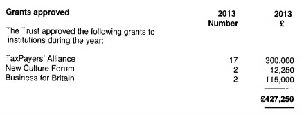 Here are the accounts for the year ending 31 December 2014 for the Politics and Economics Research Trust ("PERT"), which is registered as a charity. They show that it made 20 grants to the Taxpayers' Alliance in that year: