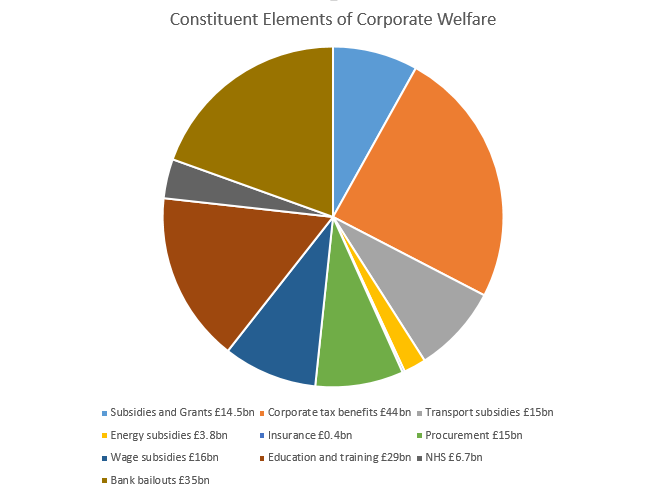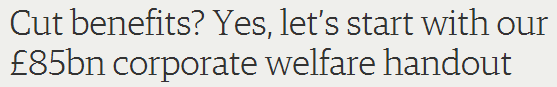 That headline comes from here but you could as easily look at "The £93bn handshake: businesses pocket huge subsidies and tax breaks"; "Britain's corporate welfare is out of control: increasing it makes no sense" and "Direct aid, subsidies, tax breaks - the hidden welfare budget we don't debate."