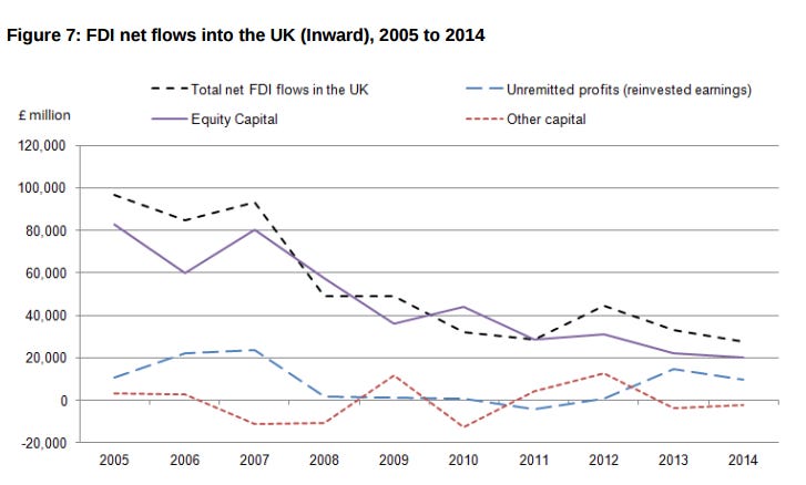 And the effect on Foreign Direct Investment in the UK - not the only measure of success, granted, but perhaps the one most applicable to the KPMG survey? Here's the ONS's chart.