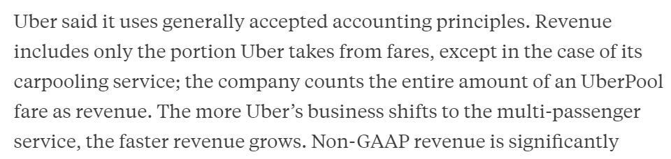 So. When you take a regular Uber taxi, Uber only includes as its revenue what it says is a brokerage fee - i.e. the bit that it doesn't pay to its workers (i.e. the drivers). But when you take an UberPool, Uber includes the whole fare as its revenue. Why might that be?