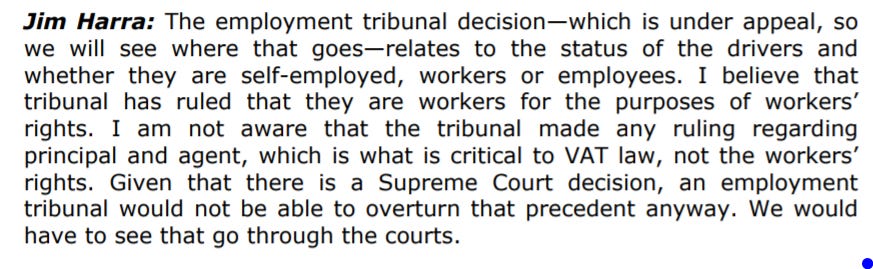 Jim Harra, Second Permanent Secretary to HMRC, went on to make a further point about the Uber Employment Tribunal decision, as it then was. He said: