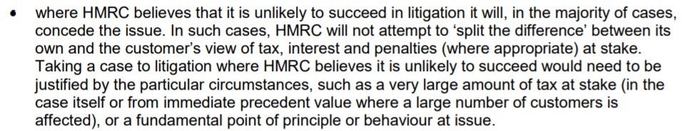 In other words, there are circumstances where HMRC will take a case to litigation even where it believes it is unlikely to succeed.