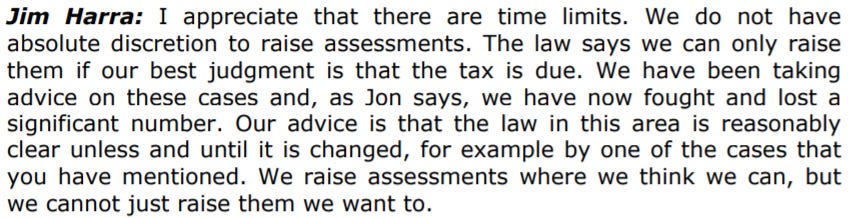 The Public Accounts Committee also put to Jim Harra, Second Permanent Secretary to HMRC, that he should raise a protective assessment to protect the position of taxpayers generally whilst the matter was resolved. To this he said: