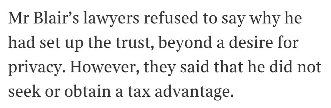 A week or so ago Alexi Mostrous, the Times journalist who has made so many of these stories his own, wrote about Tony Blair's rather complex personal finances. Those arrangements were said to be set up for reasons of privacy: