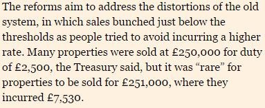 It is, of course, only superficially true to attribute (as I have done above - and as did George Osborne) the benefits of cuts in stamp duty land tax to house price buyers. The papers are full of stories of vendors pulling out of the deals because they realise that they will now be able to get more for their property; and of the house price boom expected to result. The cut in tax for buyers is immediately swamped by an increase in price and the benefit goes to those holding property wealth.