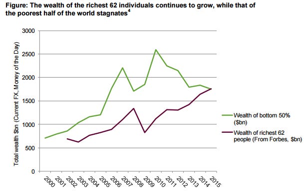 Little or no exception was taken by commentators to Oxfam's purple line - which shows a more than doubling of the wealth of the world's 62 richest people in the last six years. And most of us will shift uneasily in our chairs at this, too.